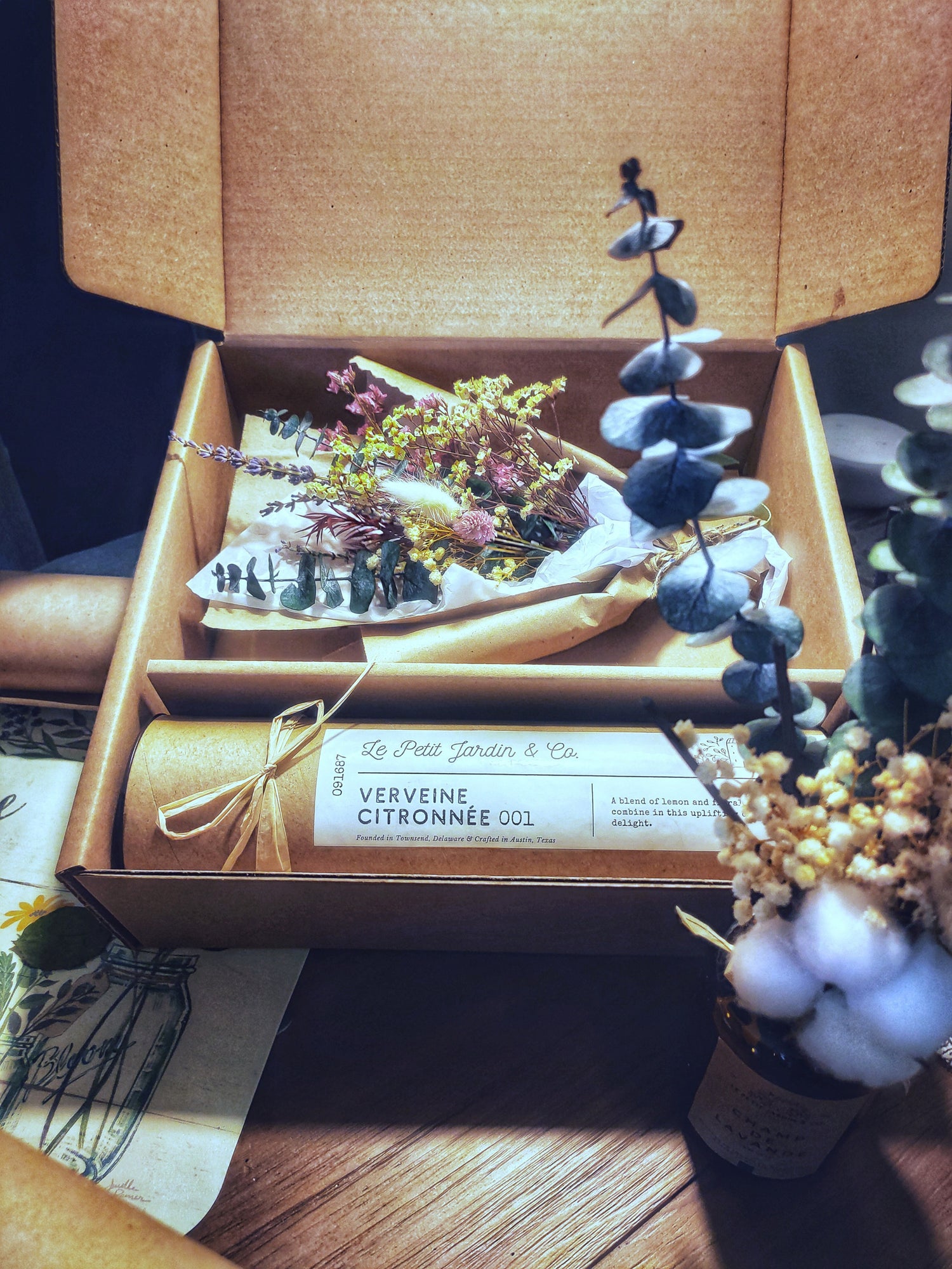 I’ve purchased from this company before and love their diffusers. This time I purchased the lemon Verbena. My husband and I love the scent (light, airy, fresh and not overwhelming. Definitely can smell the lemon notes). The arrangement is beautiful - the reeds, cotton, lavender, eucalyptus etc. the packaging was also amazing, definitely worth it! I opened the box and my instant reaction was “wow”. In the box, there was the cotton and eucalyptus “bouquet” carefully wrapped. There was also a cylinder box that contained the glass bottle, scented oil, reeds, and additional dried flowers. There was a personalized note which I thought was so sweet!